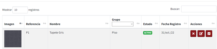 En administración de materiales se encuentran todos los materiales cargados anteriormente. Todos los materiales se pueden buscar por su nombre en el buscador o filtrarlos por grupo si se desea hacer una búsqueda más rápida y no se sabe el nombre del material. De igual forma se puede eliminar, editar, y activar o desactivar un material si este ya no se quiere mostrar dentro de 3D live. Lo anterior se puede hacer dentro de los recuadros que se ven en la imagen.