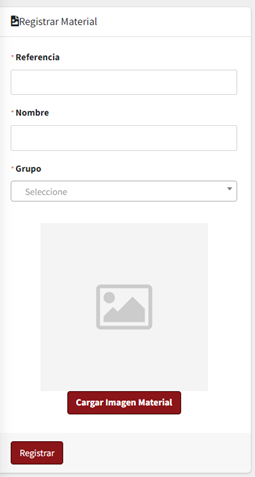 En el administrador de tareas también se pueden añadir nuevos materiales. Para agregar un nuevo material es obligatorio escribir una referencia, un nombre, y asignarle un grupo y en el caso de que se quiera crear uno nuevo solo hay que escribir el nombre donde se selecciona el grupo y presionar enter. Por último, hay que cargar la imagen presionando donde dice cargar imagen material y seleccionar la foto que se desea utilizar en los archivos de su computados. Para guardar solo hay que presionar registrar al finalizar el proceso.