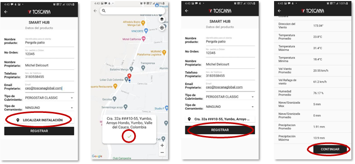 1. Si el proceso de emparejamiento ha sido exitoso, la aplicación le solicitara los datos de instalación y registro de la pérgola, tales como: Nombre del propietario, teléfono, email, y numero de registro.